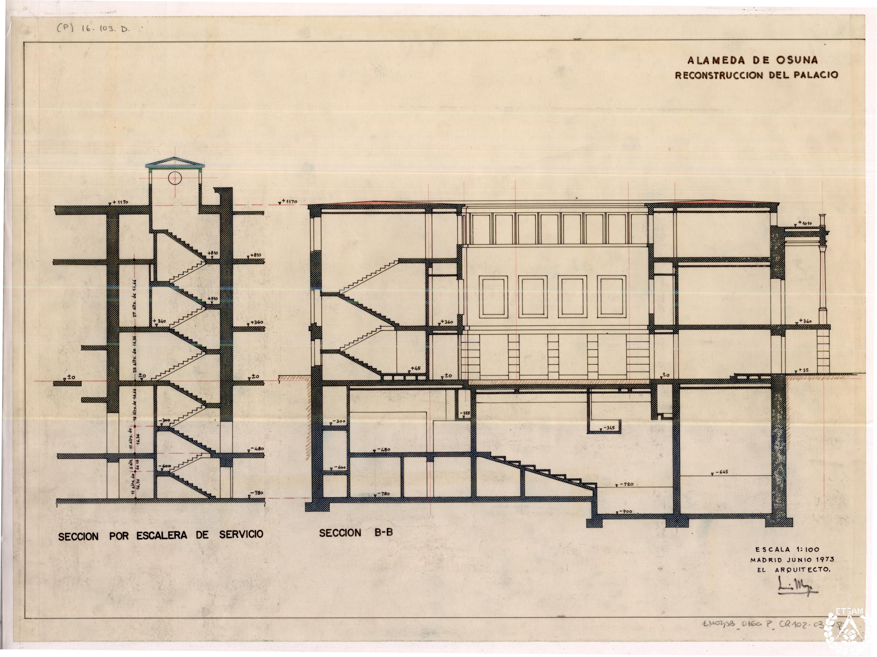 Alameda de Osuna. Reconstrucción del palacio. Sección BB. Sección por la escalera de servicio